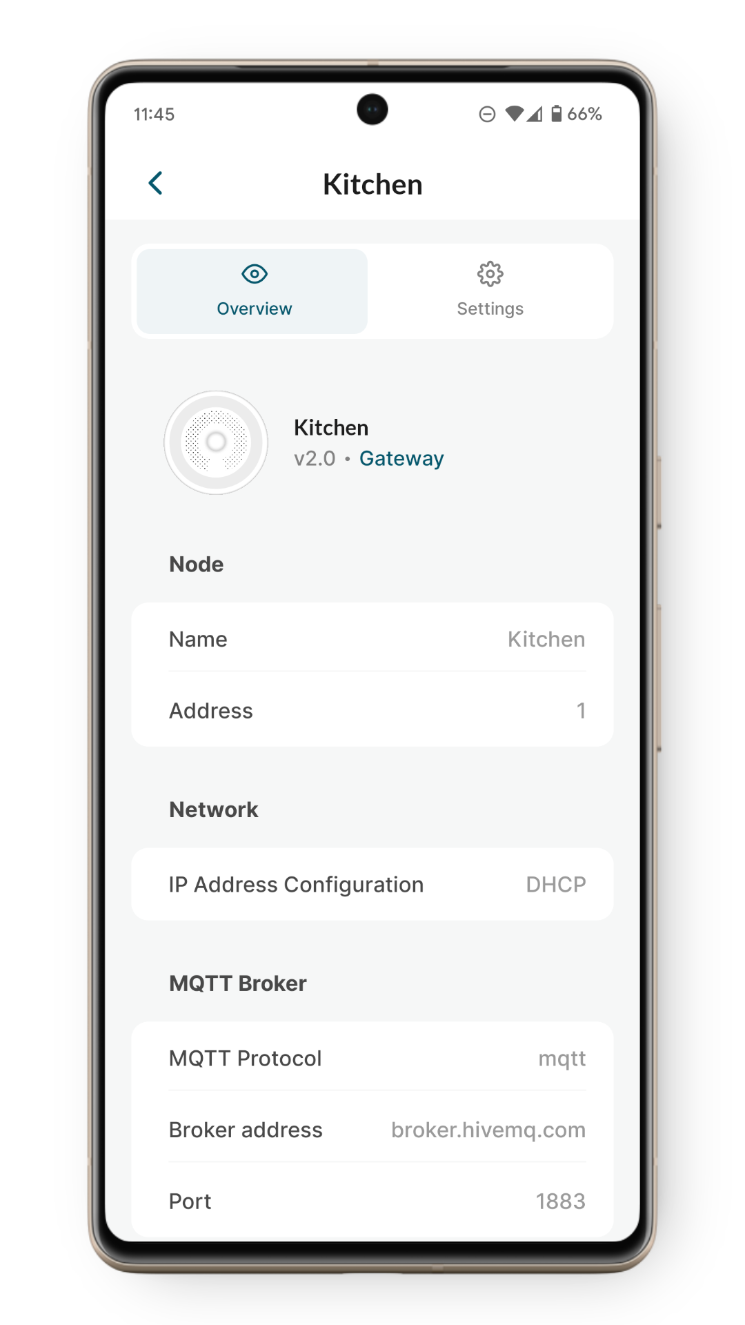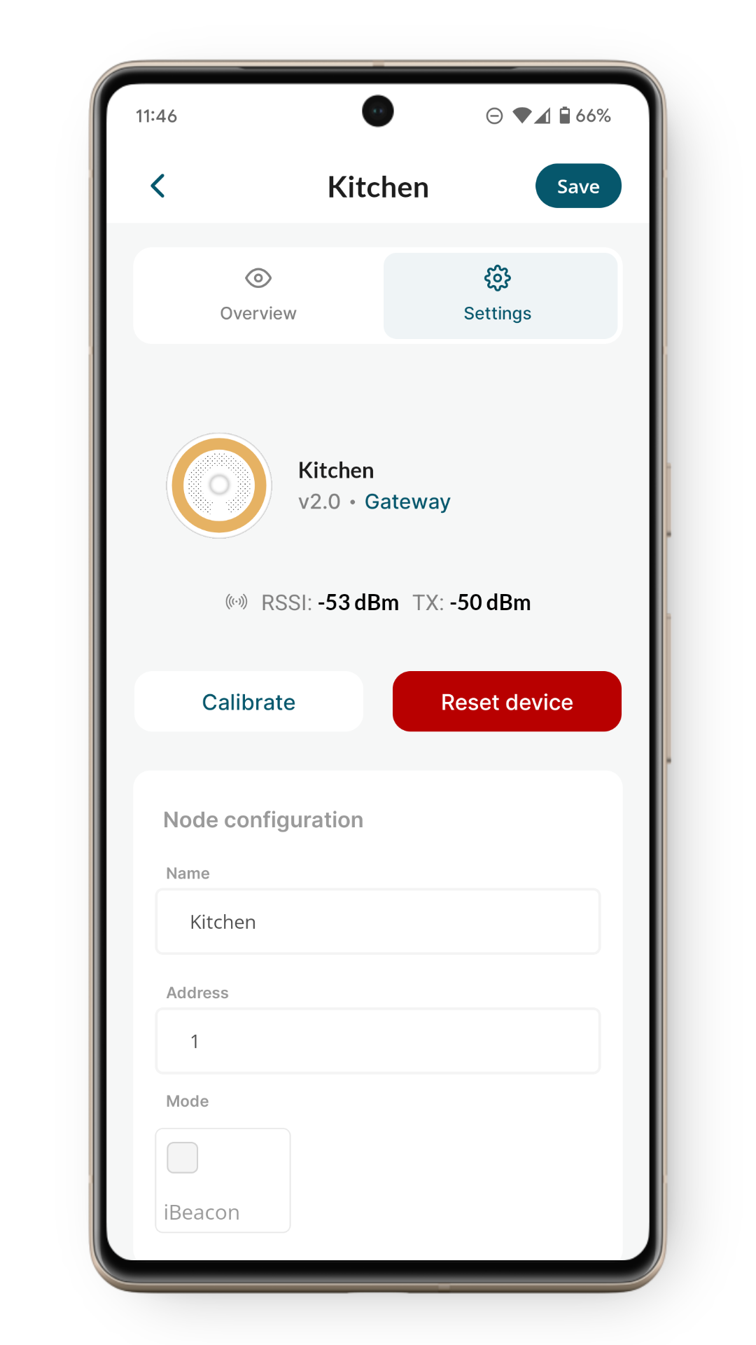 Select 'Settings' to start recommissioning the device. Device should display yellow static animation after a few seconds and the following screen should open: